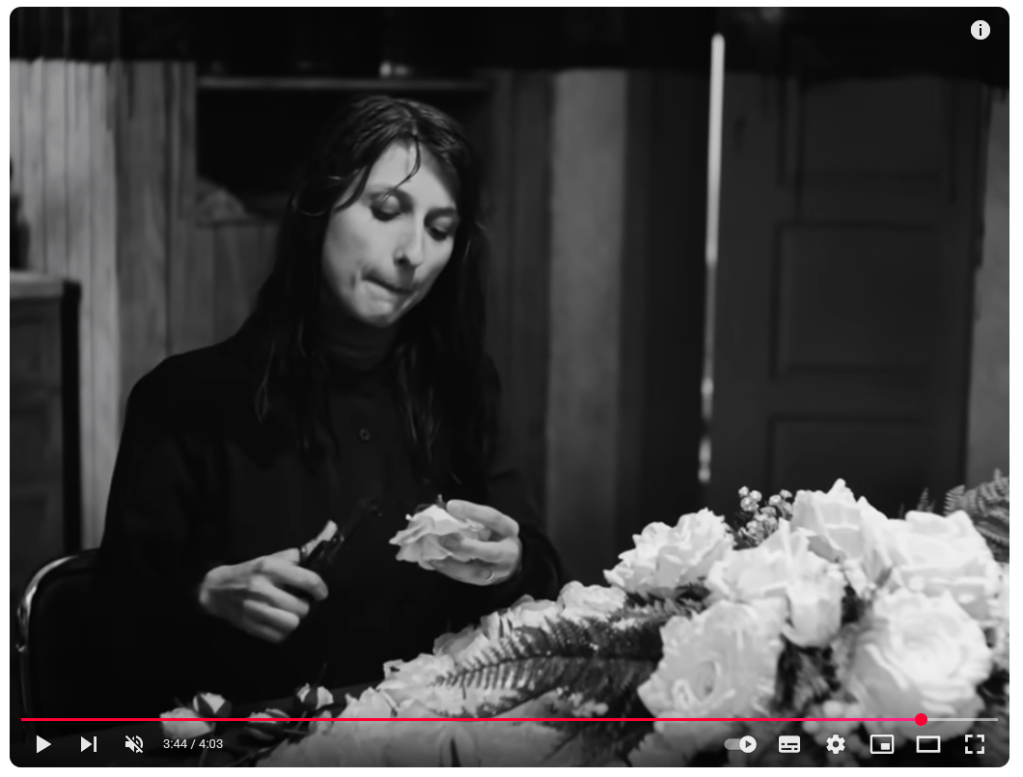 La prima persona che vediamo è una donna che sta lavorando a questa bellissima composizione floreale. La sua espressione è triste, quindi possiamo supporre che la composizione che sta preparando sia per una persona cara che è venuta a mancare, ma le sue mani sono sicure nel gesto manuale di cui si sta occupando, quello di potare le rose. E’ un compito difficile, non ha sicuramente voglia di farlo, probabilmente ha un groppo nella gola dal dolore, ma qualcuno si deve pure occupare di queste tristi ma dovute incombenze e lei si è presa la responsabilità di concludere questo compito.