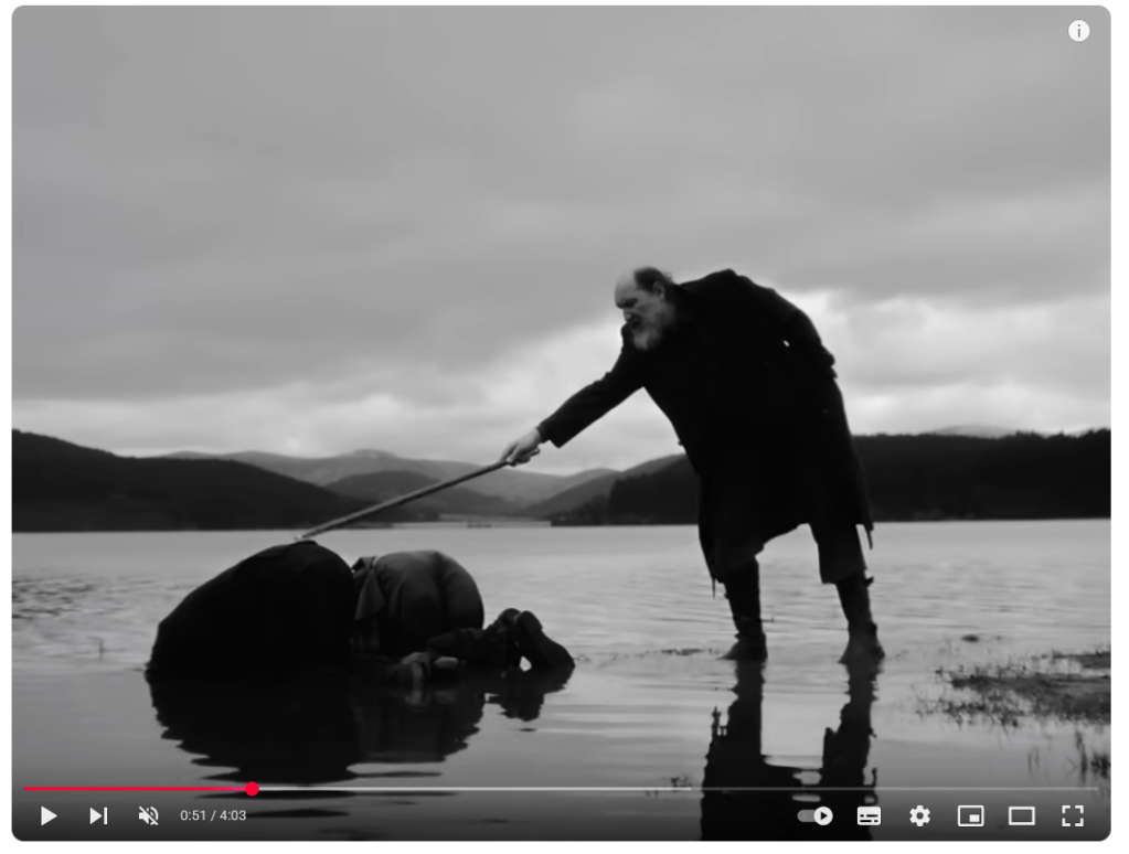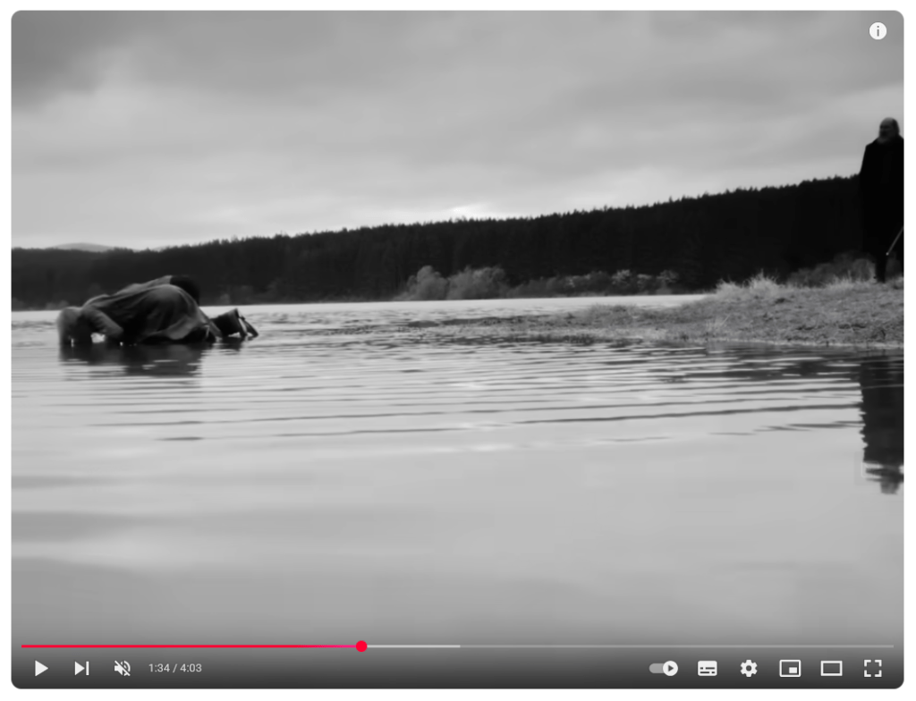 Il nostro sguardo si allarga su lago. Un personaggio misterioso, che sembra essere il custode del luogo, o l’ufficiante di un rito, si avvicina ad una coppia chinata con la testa sott’acqua. La cosa interessante è che questo personaggio misterioso ha con sé una valigia. Forse non appartiene davvero a questo luogo e viene qui solo per celebrare questo rito? Forse nella valigia ci va qualche tipo di oggetto che permette l’esecuzione del rito?