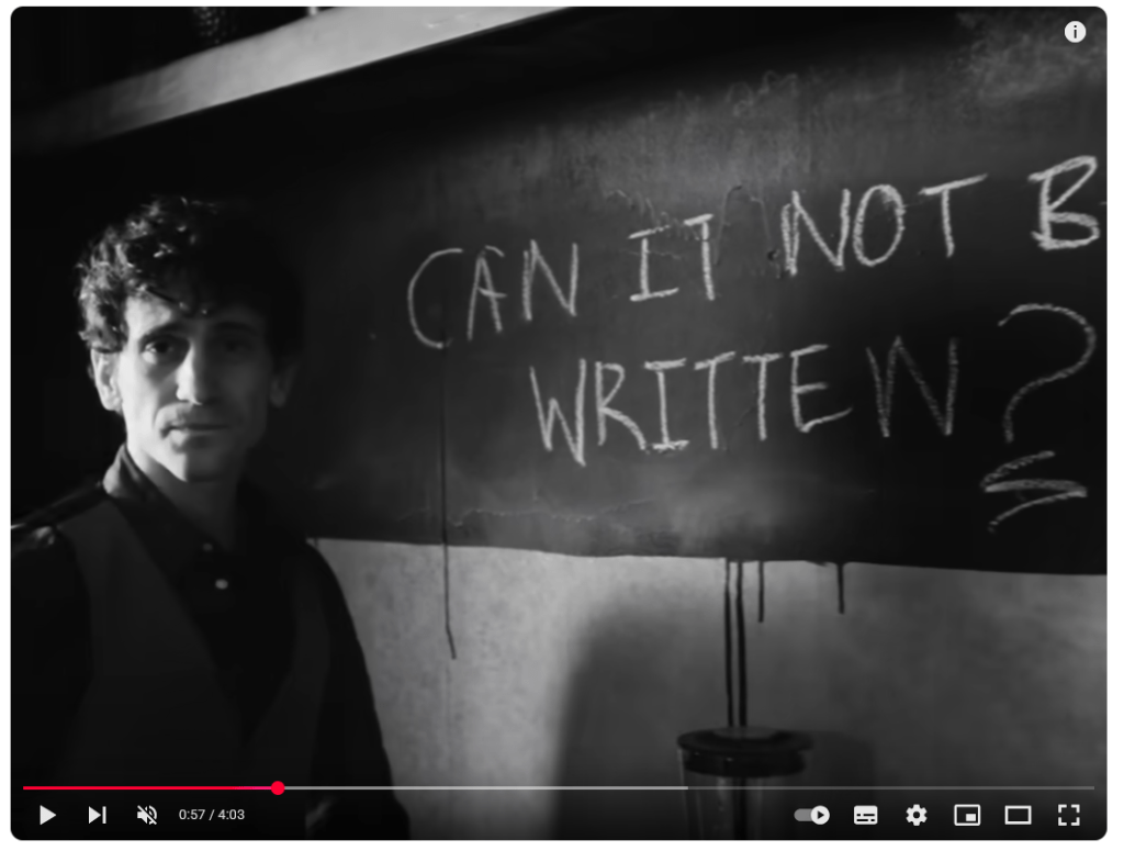 L’uomo, dimostrando perfettamente la mia teoria sulla sua identità, chiude il rubinetto in modo riluttante e scrive sull’ardesia: CAN IT NOT BE WRITTEN? (NON POSSIAMO FARLO IN FORMA SCRITTA?)